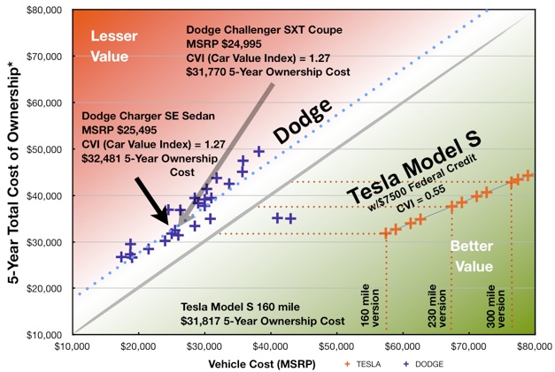 In the table below, cost of ownership is estimated for the purchase of new 2011 and 2012 Dodge cars and the Tesla Model S. The purpose is to compare your estimated cost of ownership for 5 years to a Dodge vehicle you may potentially buy, to that of a Tesla Model S. Here, cost of ownership is calculated by adding the following: